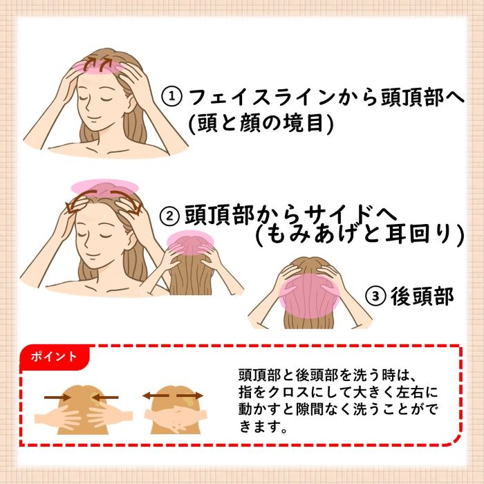 指は髪の上からではなく、髪の毛の中に入れて頭皮に当たるようにしてください。