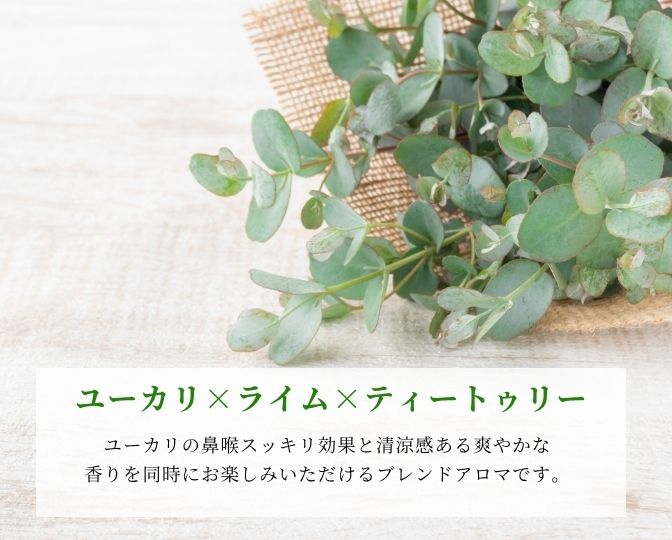 今回は定番の「ユーカリ・ライム・ティートゥリー」のブレンドです。ユーカリの鼻喉スッキリ感覚と清涼感のある爽やかな香りを同時にお楽しみいただけます。