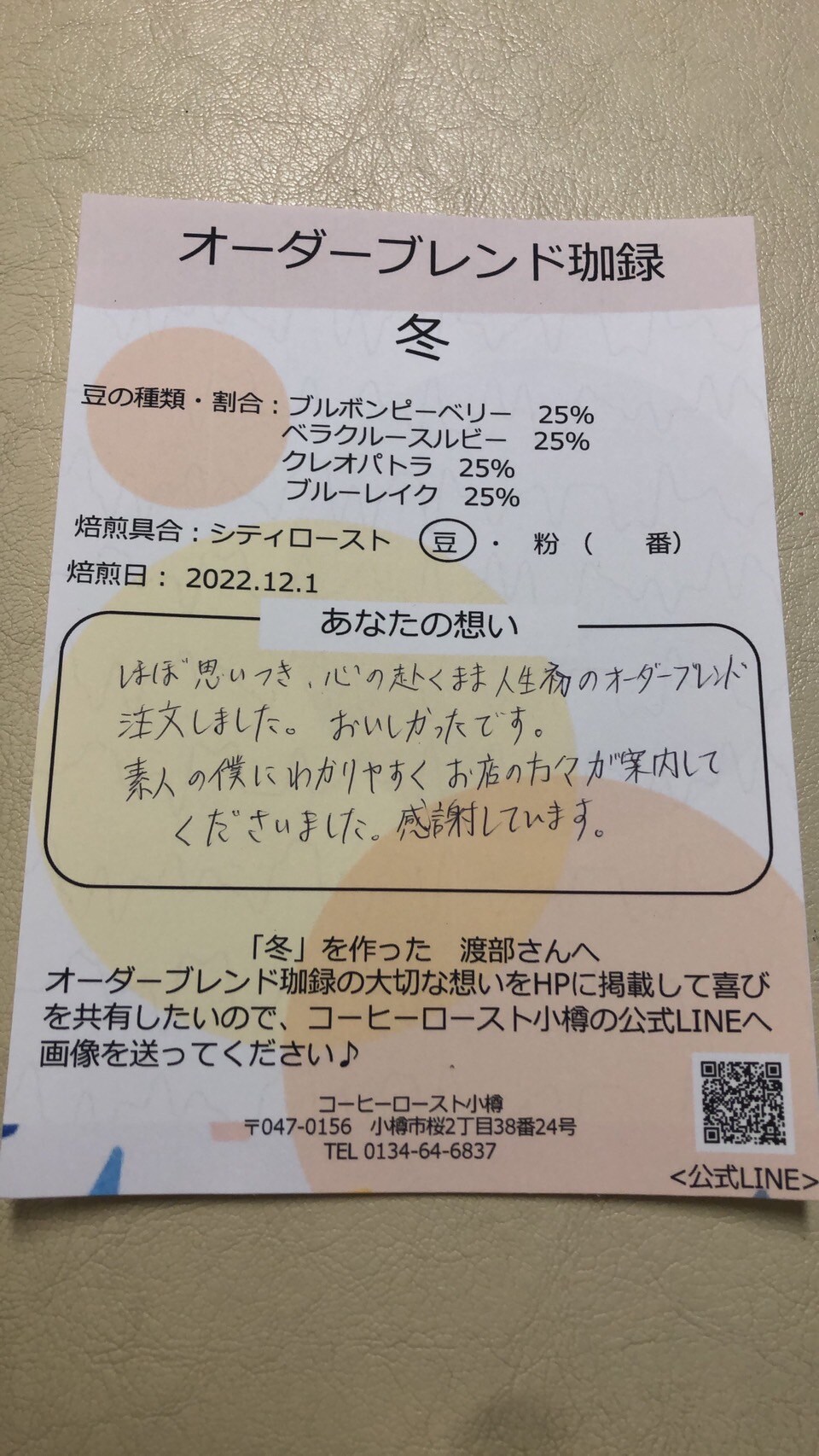 心の赴くまま、人生初のオーダーブレンドを作っていただけて嬉しく思います。
