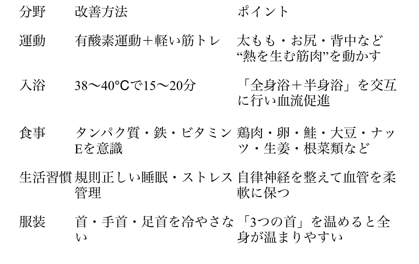 冷え性は「熱を作れない・運べない」状態。改善には「筋肉」「血流」「自律神経」「食事」を整えることが大切です。 毎日のちょっとした工夫で、体温が安定し、冷えにくい体になります。