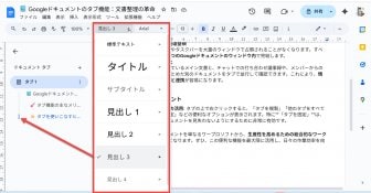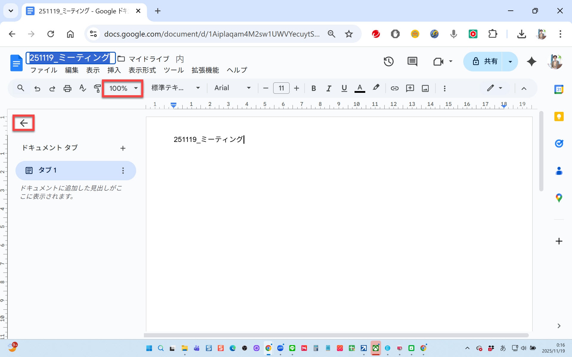 - 紙面が狭かったら左向けの矢印をクリックすると、ドキュメントタブは隠れます。