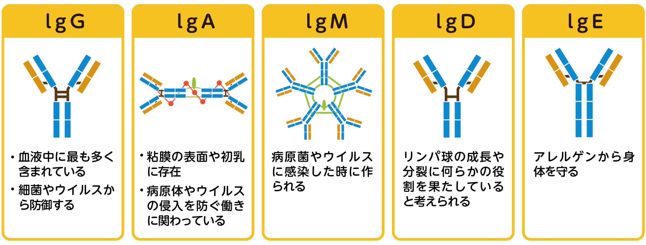 抗体とは抗原を認識してやっつけるための行動に移し、身体を外からの攻撃から守る働きのあるタンパク質の事で、5つの種類(IgG、IgM、IgA、IgE、IgD)があります。