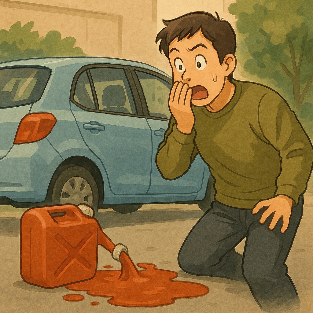 後ろでポリタンクが倒れました。 慌てて車を止めて見ると、 灯油が漏れて、車内が大惨事です。