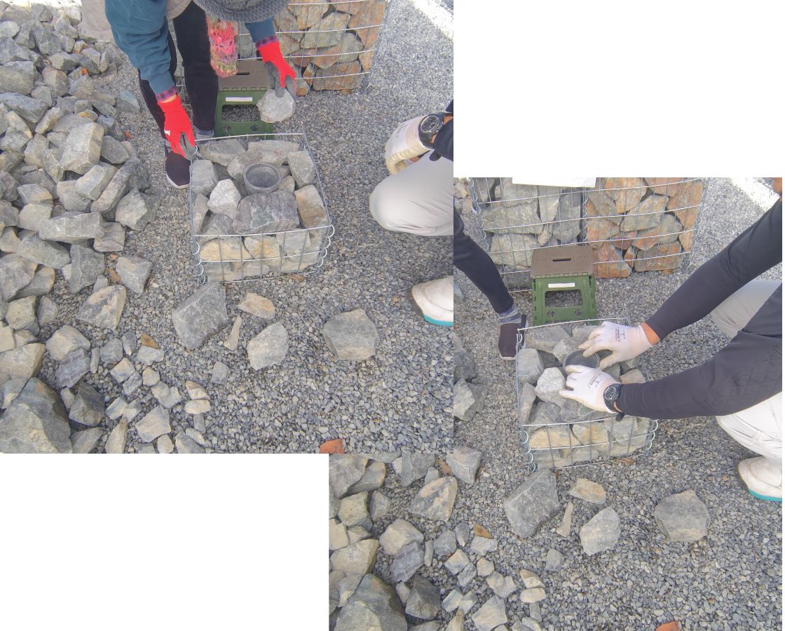そのあと内側に細かい石を詰めて足場をつくりましょう。」