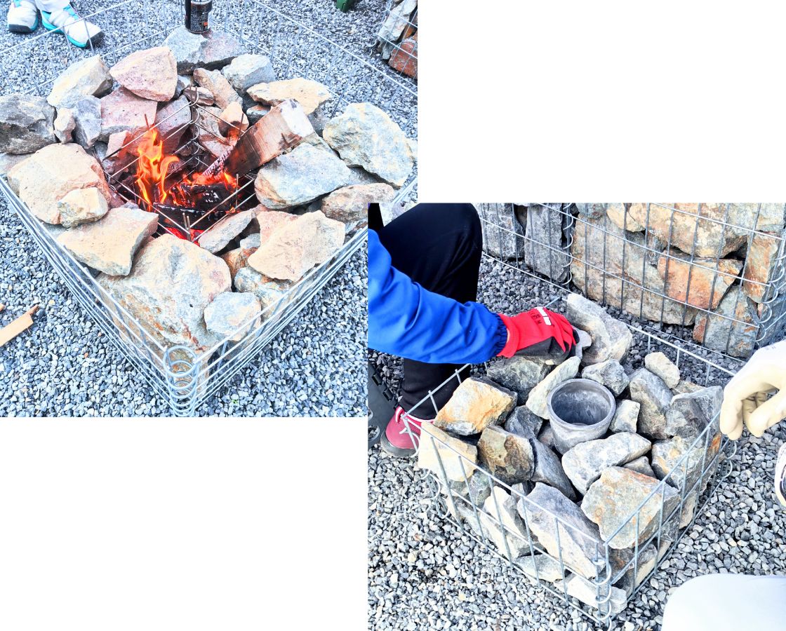 そこで今回も、前回に続き ガビオン暖炉 に火をくべて会場をしっかり暖めてスタートしました。