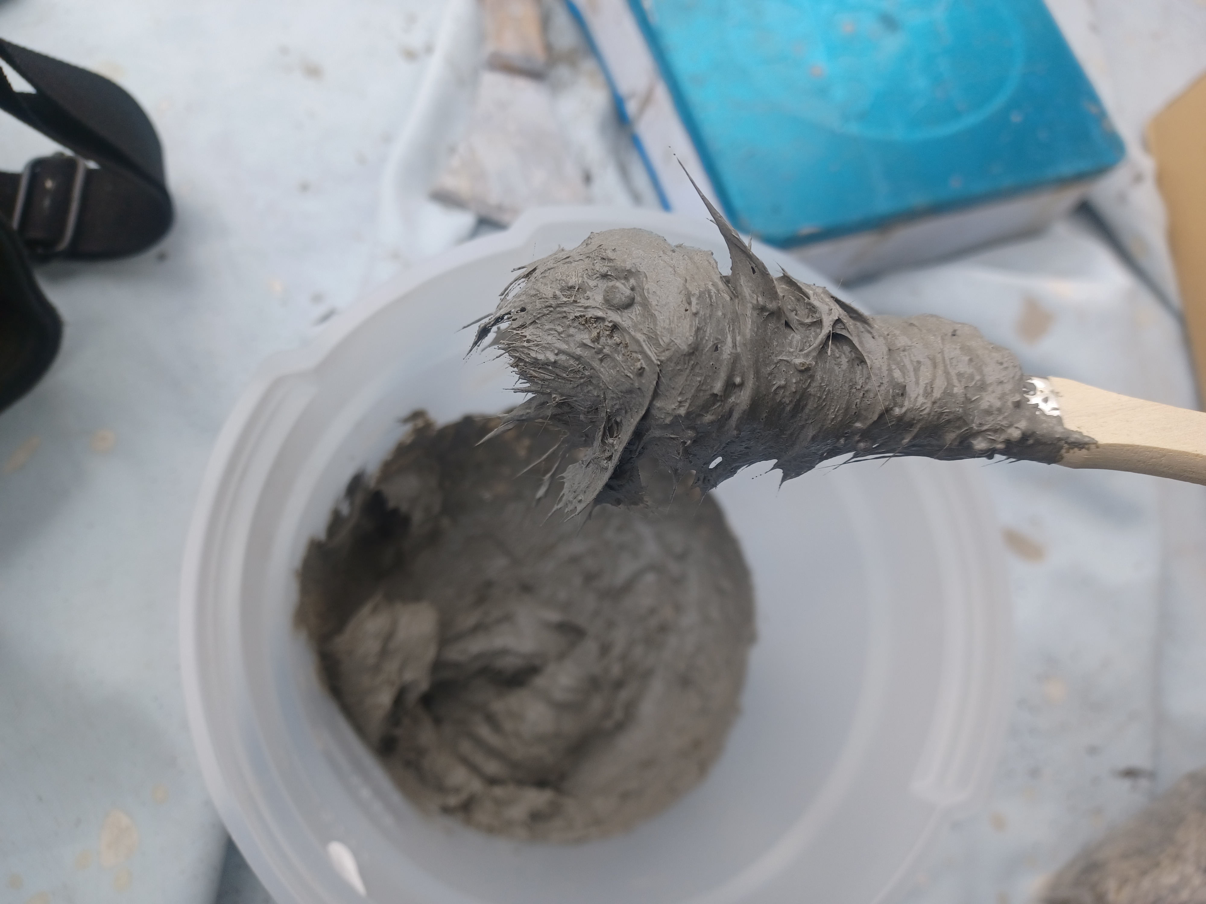 強度を高めたいという時は砂を加えれば良い訳ですが、今回は動く手摺を固定させるという目的ですのでバサルト繊維のみを混ぜて伸縮性を高めています。