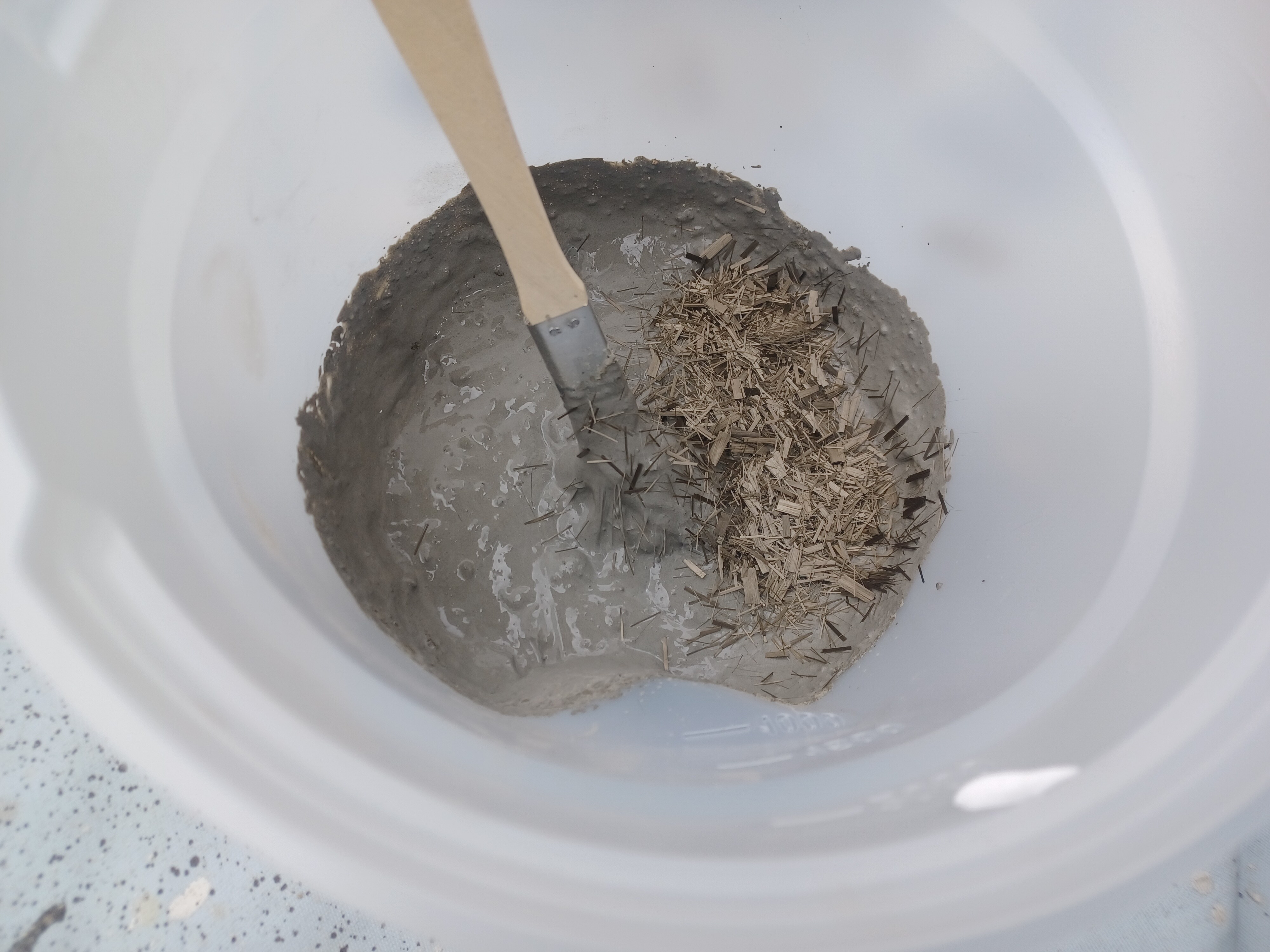 樹脂とセメントを混ぜ、その中にバサルト繊維を入れて混ぜます。
