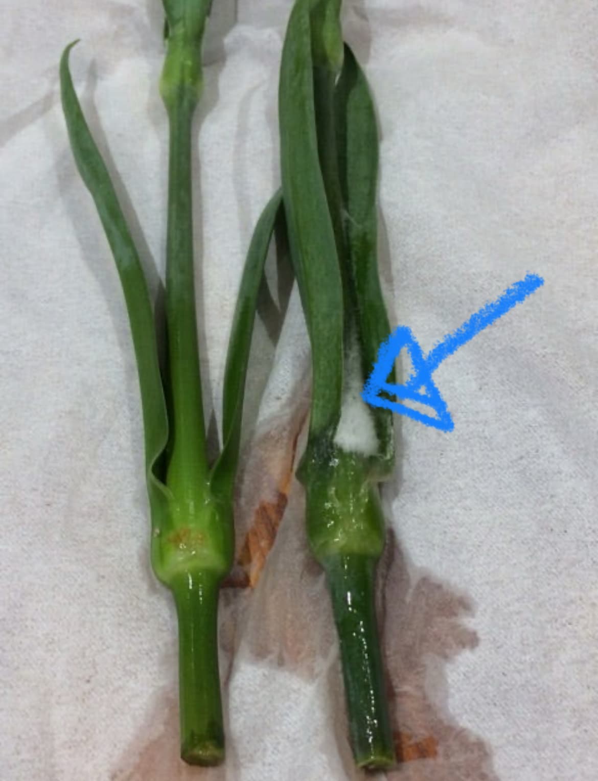 綿のような白い物質。繊維?…いや、多分カビ。