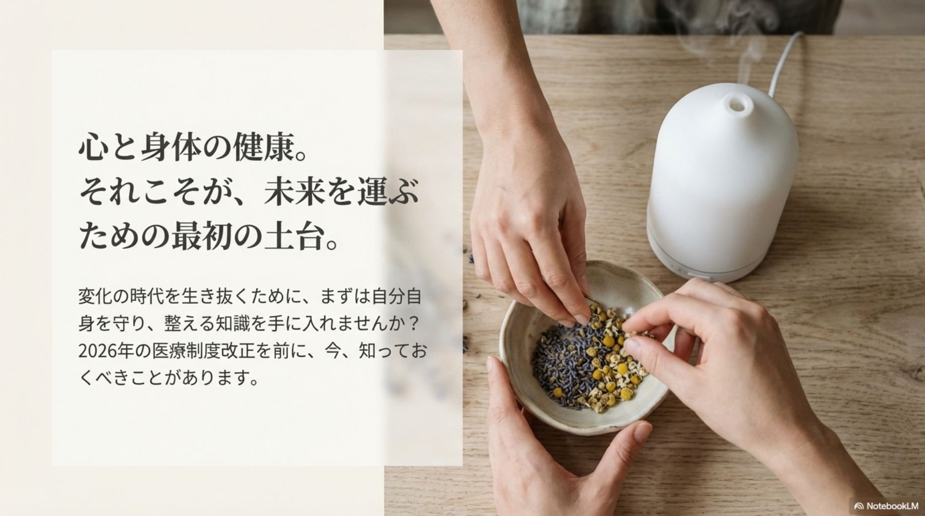 2026年の医療制度改正を前に、これからの時代に必要なのは 「病院に頼る健康」だけでなく自分で整え、守る健康です。