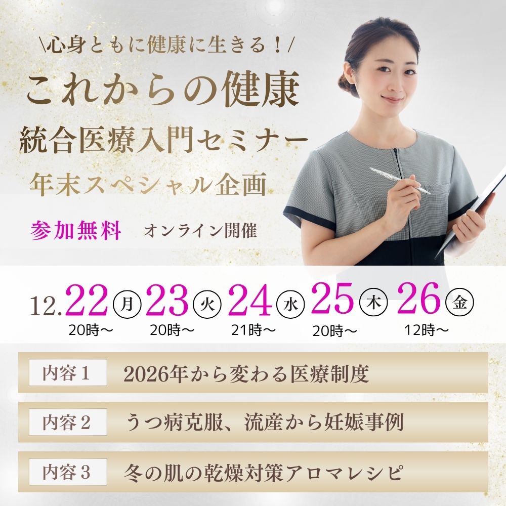 2026年から変わる医療制度の話、うつ病克服・流産から妊娠に至った実例、冬の乾燥対策アロマセルフケアまで、
