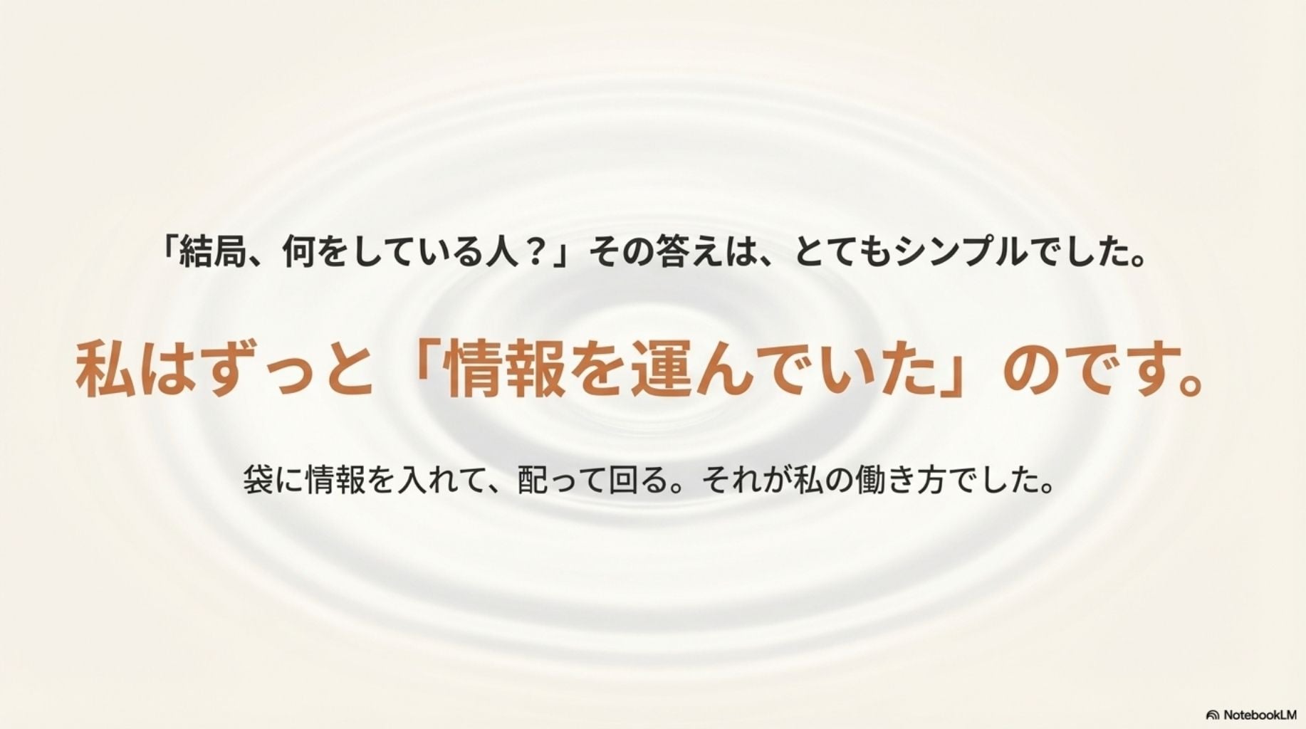 今となって気づくことも多いのですが、簡単に私を説明すると「情報を運んでいる人」「袋に情報を入れて配って回ってきた働き方」の仕事をしてきたのです。