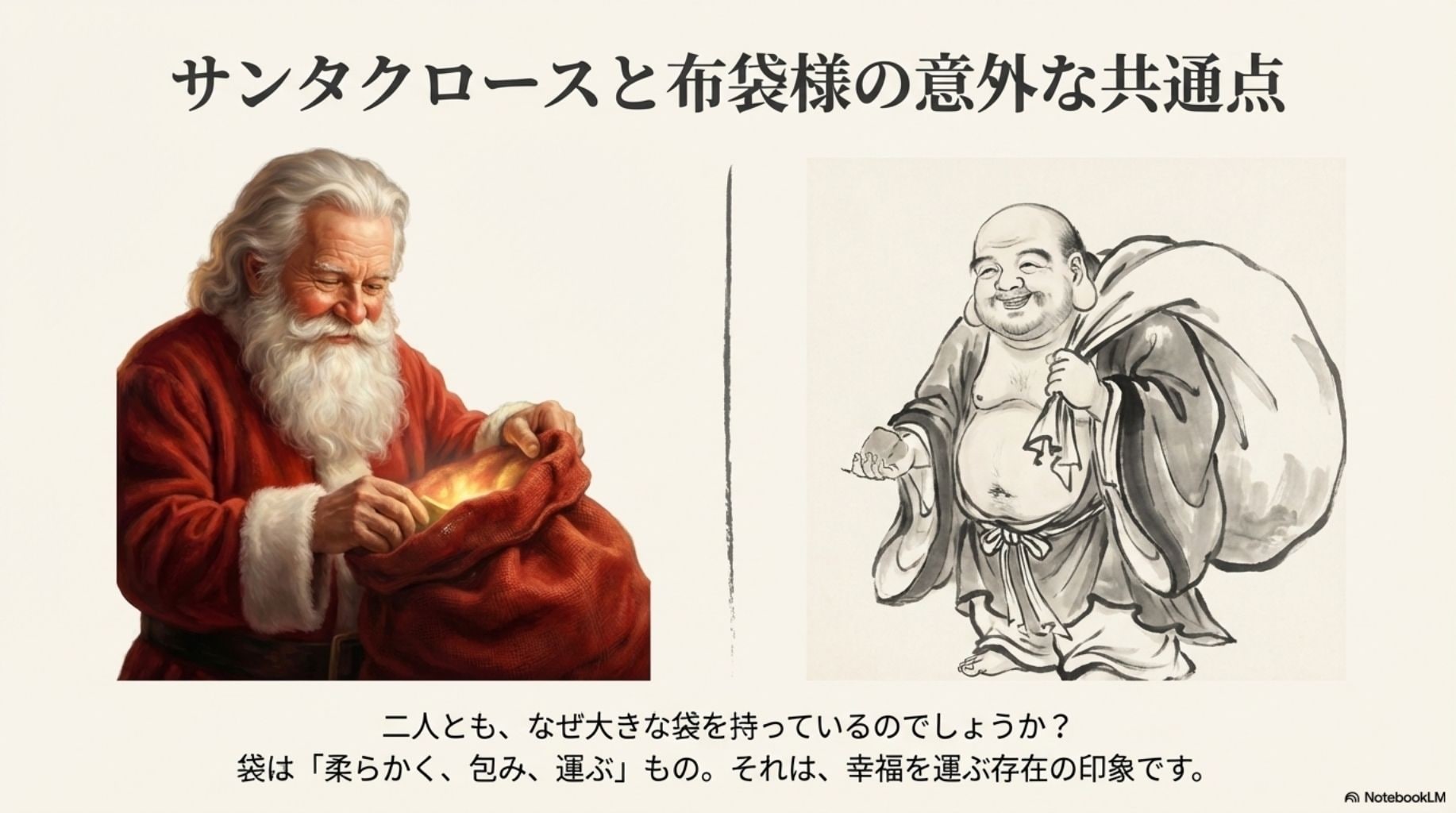 サンタクロースは袋を担いで贈り物を届けます。 似た神様が他にもいます。それは「布袋様」です。