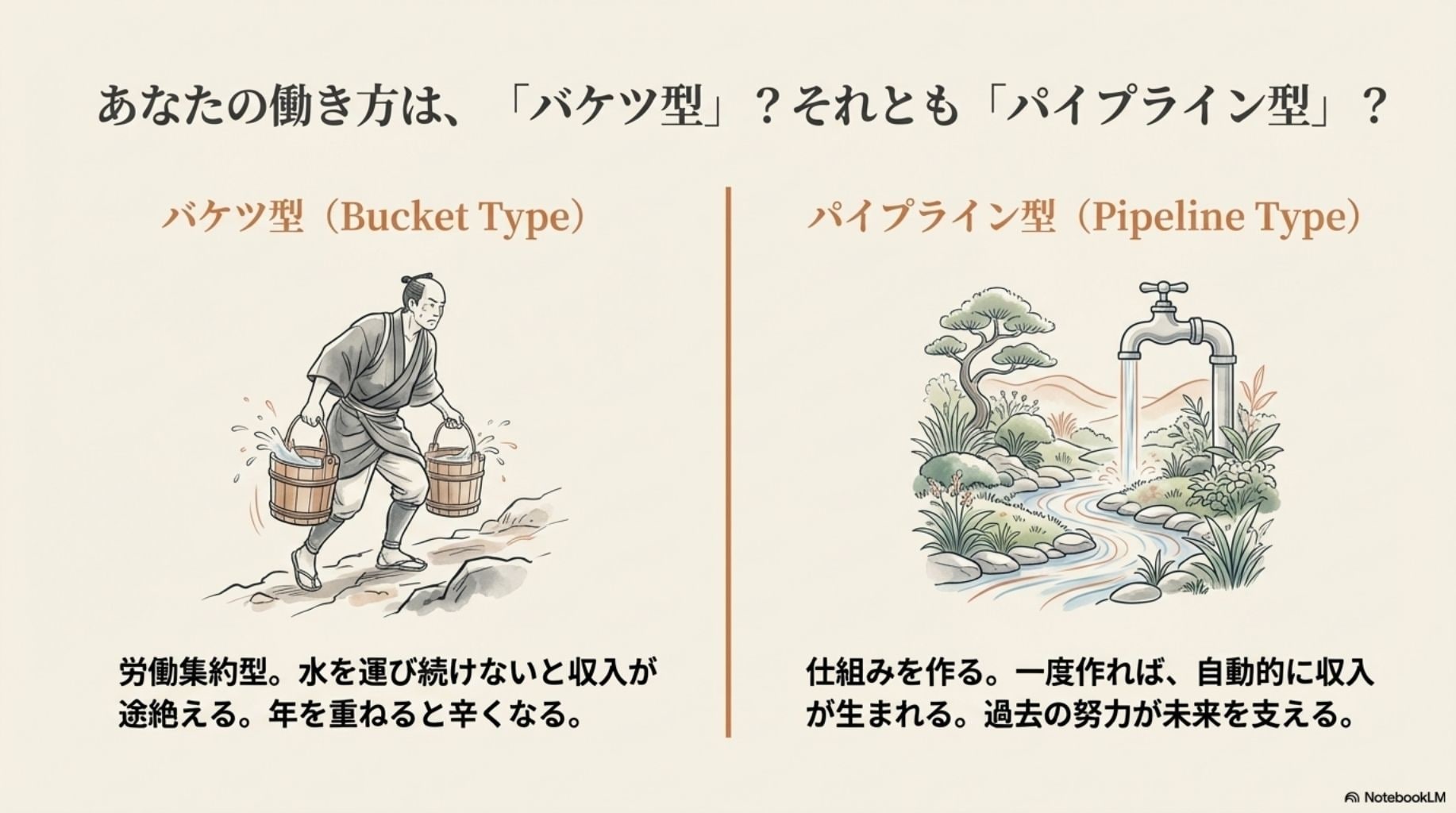 バケツ型労働集約型だけだと人生100年時代、年をとっても水を運ぶのがきついのです。だからこそ他の働き方もあることを伝えてきました。