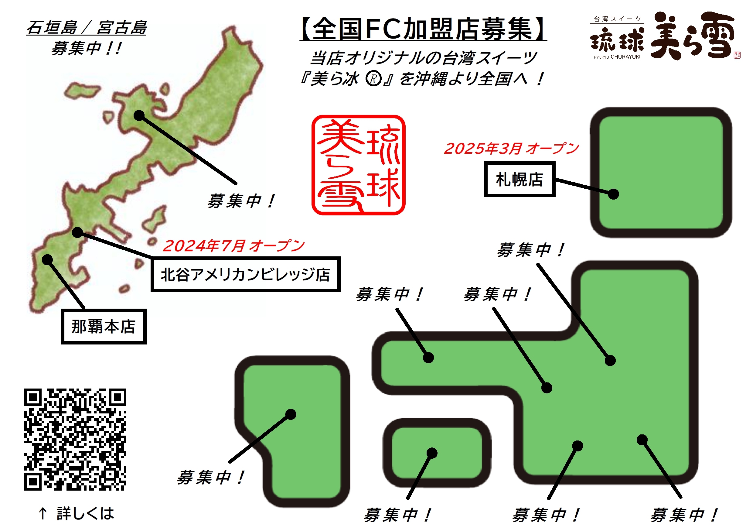 これまで「この商品を扱わせて欲しい!」というオファーを多数頂戴して参りましたが、「ある程度の基盤ができるまでは絶対に店舗を増やさない!」という強い思いで、無条件に全てお断りさせていただいておりました。一度オープン10周年を機に、沖縄県内限定で FC加盟店を募集させていただいたのですが、店主の長期入院や新型コロナと重なったりでずっと募集を閉じておりました。この度、全国展開に向け店名も『琉球美ら雪』へと変更し、より強い体制作り(ツクツク!!!アプリ の導入)も整ったため、今回は沖縄県内限定ではなく、全国に向けてFC加盟店を募集させていただく運びとなりました。