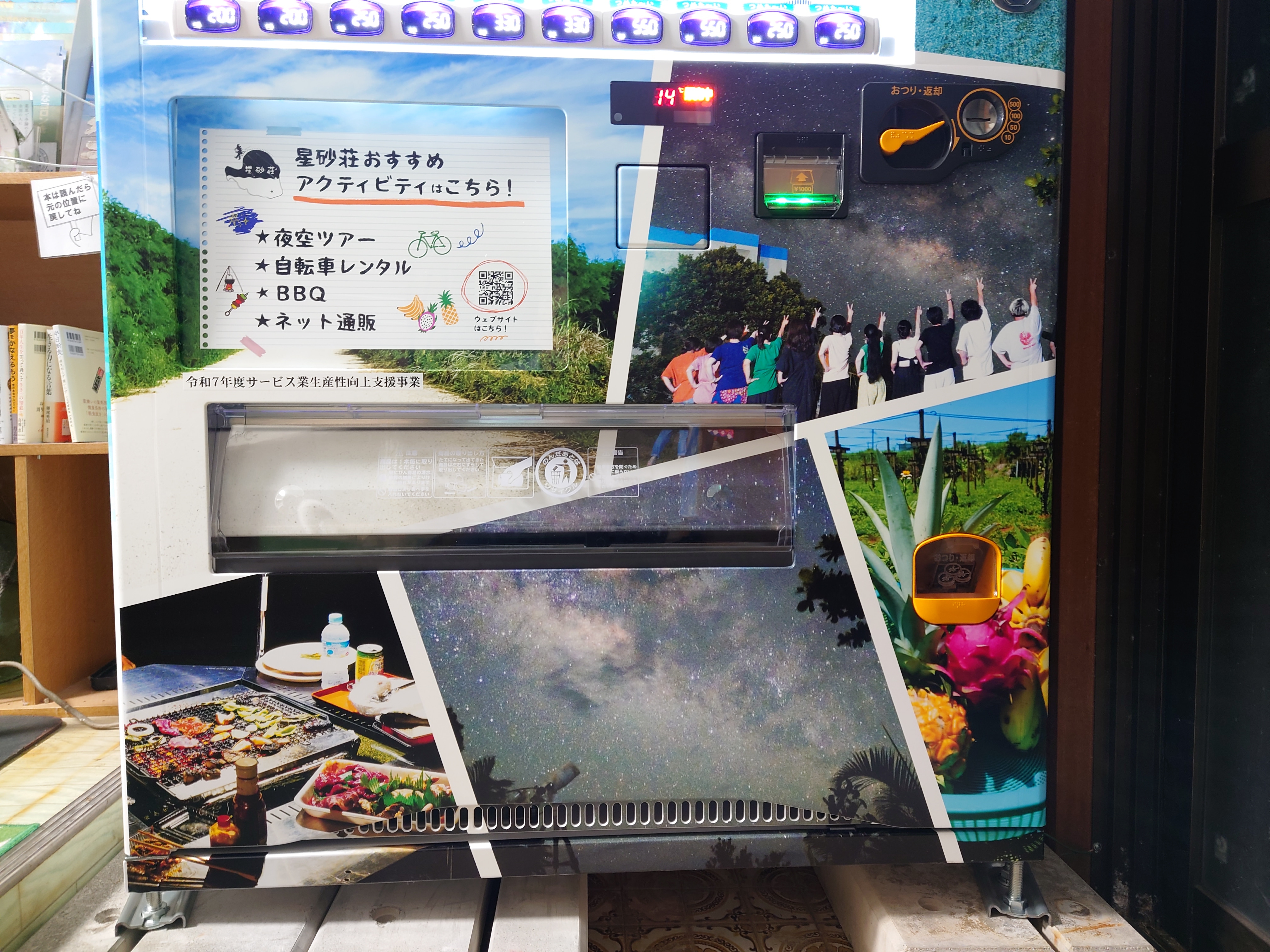 自動販売機のパネルには、星砂荘おすすめのアクティビティ情報も掲載しました。