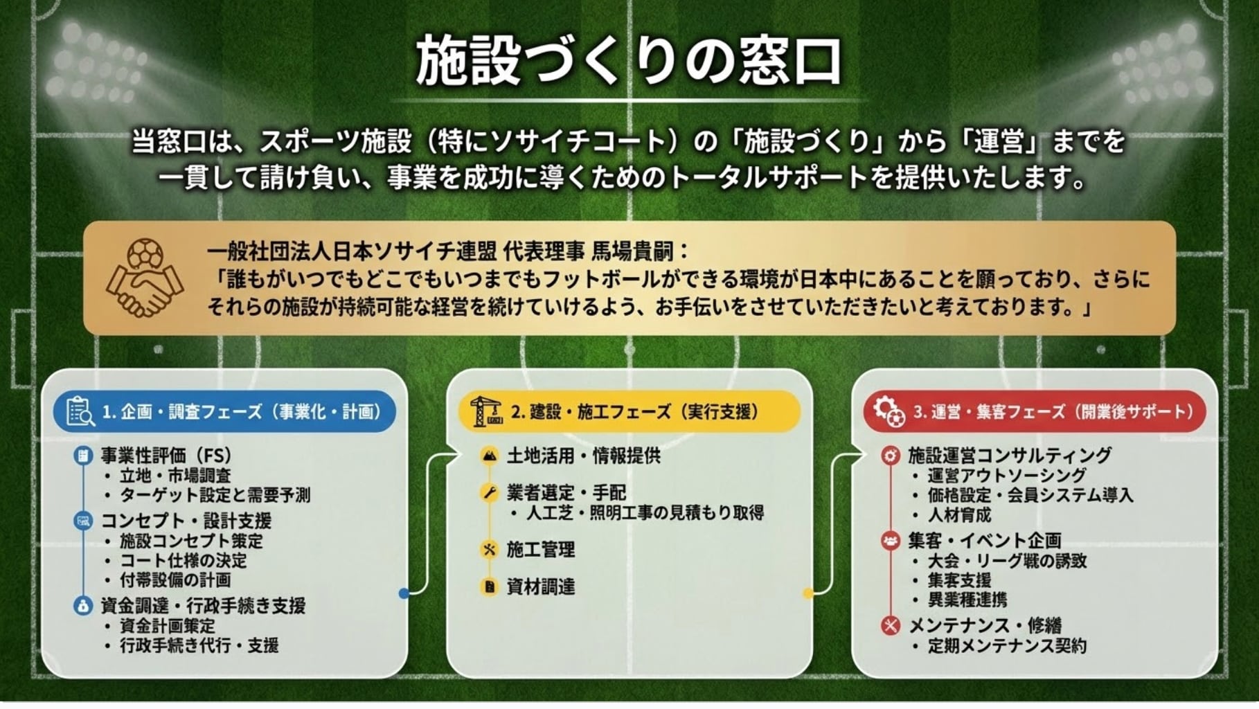 当窓口は、スポーツ施設(特にソサイチコート)の「施設づくり」から「運営」までを一貫して請け負い、事業を成功に導くためのトータルサポートを提供いたします。お客様の計画に対し、施設の設計・建設から、完成後の集客・運営に至るまで、豊富な実績と知見に基づいた支援を行います。