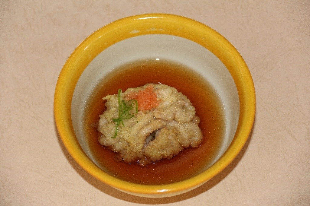 揚げたての白子天をまるいちこだわりのめん汁で御提供!