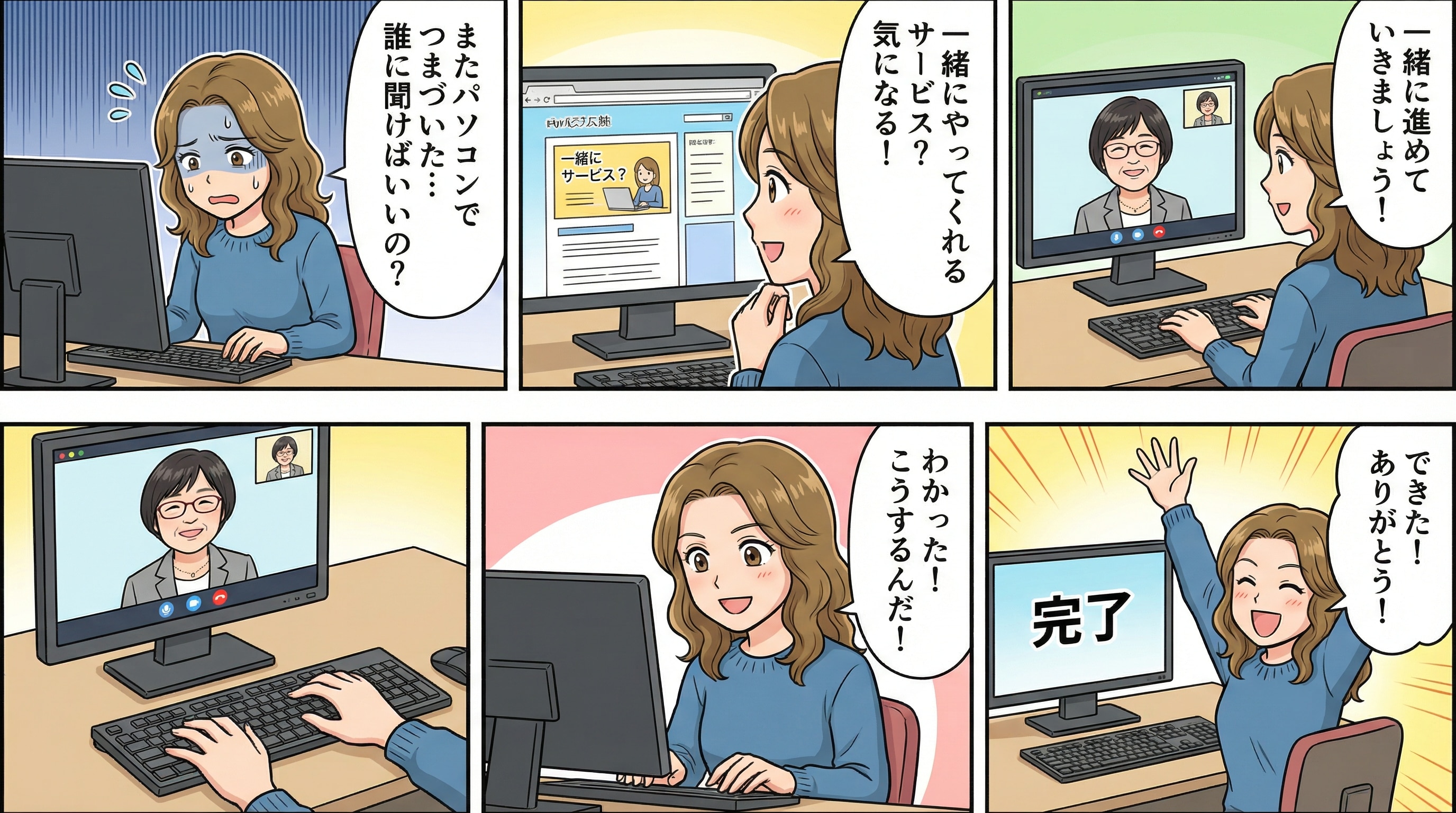 《伴走型オンライン秘書》の仕事のイメージを、まんがでやさしく紹介