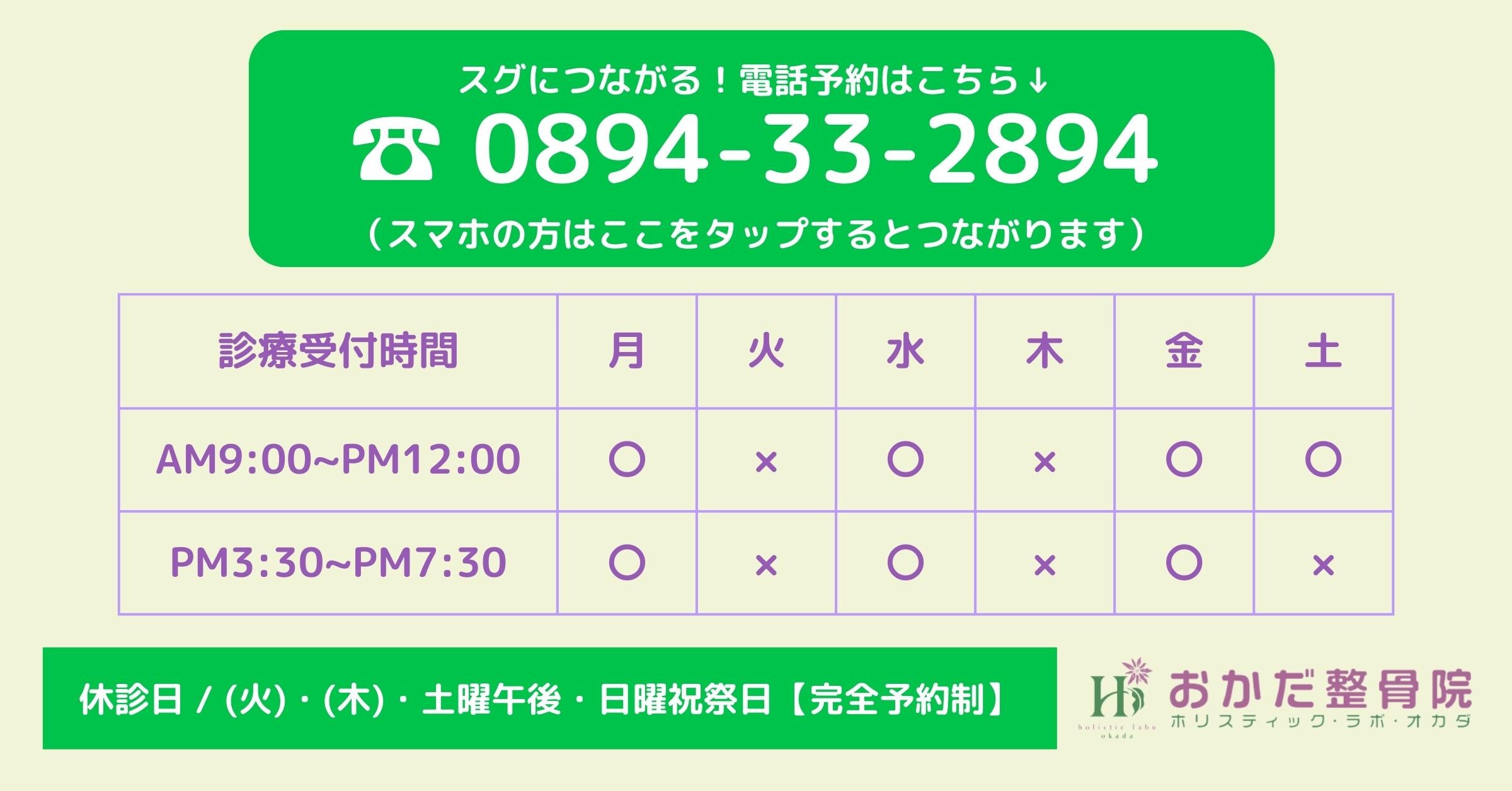 ※上記の休診日(日曜祝祭日を除く)でも緊急の際は松山院(TOTAL BODy PRO)での診療は可能なのでご連絡ください。