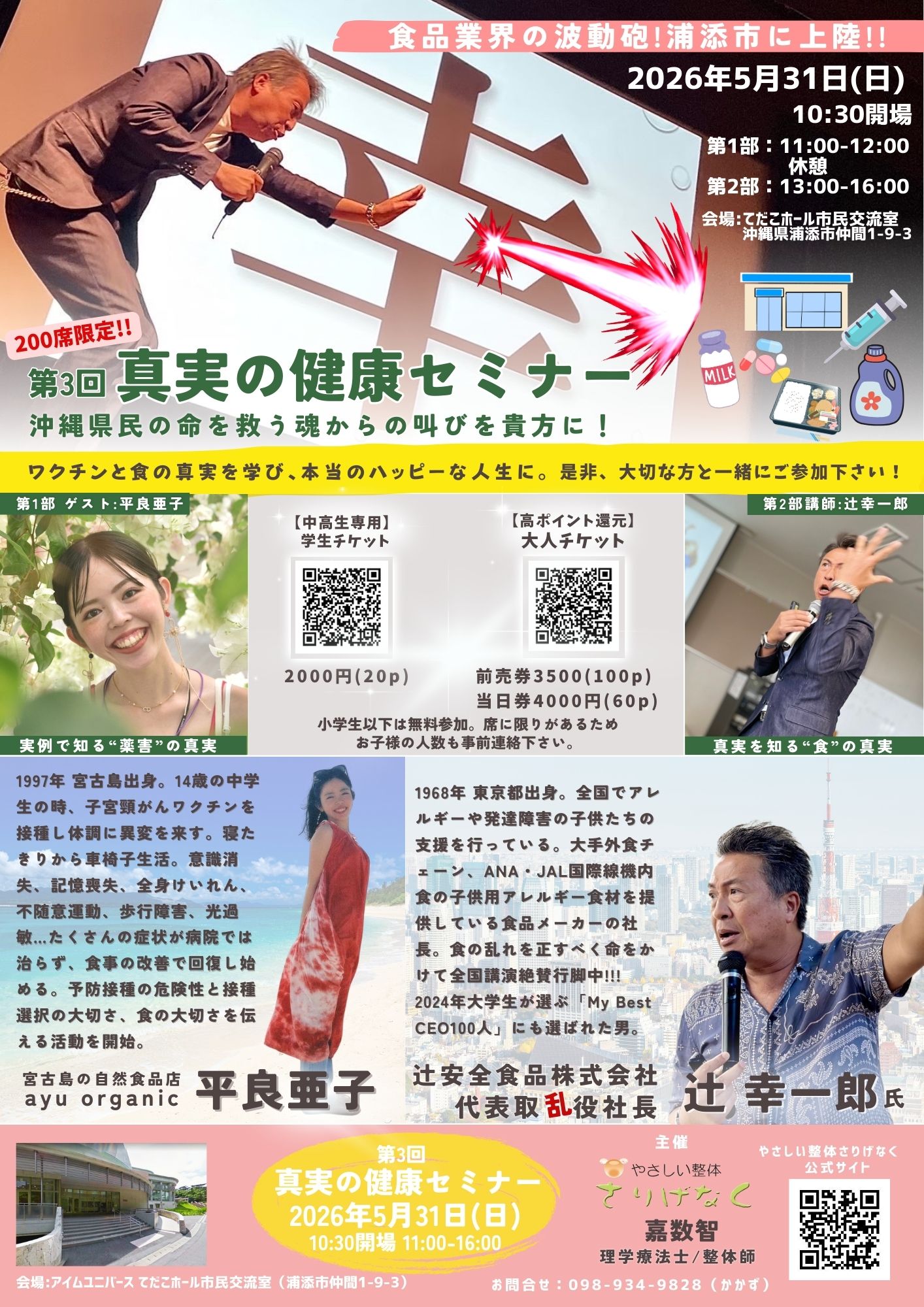 第二部は、メイン講師の辻安全食品株式会社 代表取乱役社長の辻幸一郎氏。日本初のアレルギー対応食品の会社で、これまでにアレルギーや発達障害と言われていた子どもたち100万人以上を救ってきた。こどもたちの未来のために命がけで、病院や薬、病気の闇を暴露し、ホントの「真実の健康」を全国で魂からの叫びを沖縄のみなさんに届けていただきます。