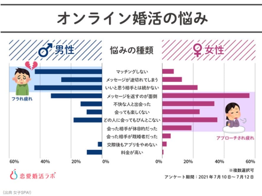 現在の婚活手段として主流になっているオンライン婚活サービスですが、婚活男性と婚活女性では悩み原因とボリュームゾーンに違いがございます。