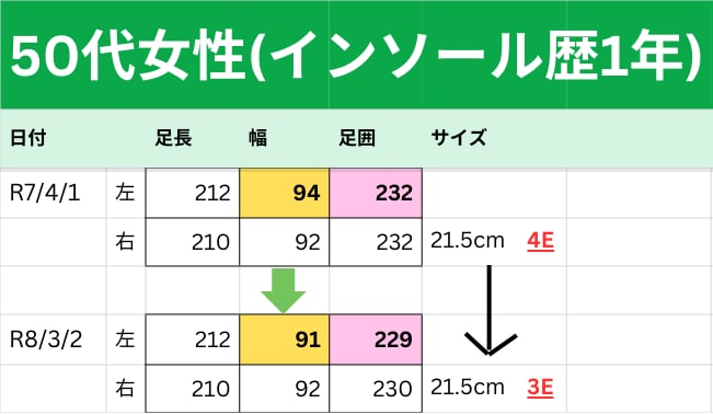 左足の幅や足囲の変化があり、ウィズサイズが4E→3Eに変化しました!