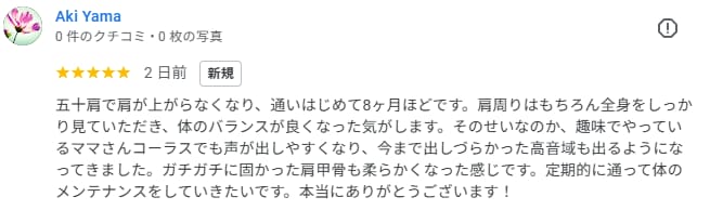 『五十肩で肩が上がらなくなり、通いはじめて8ヶ月ほどです。肩周りはもちろん全身をしっかり見ていただき、体のバランスが良くなった気がします。