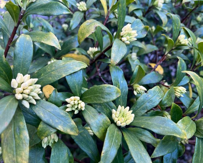 わが家の沈丁花。エネルギーをじっとため込んでいそうな開花前です。おそらく1~2日で開花します。