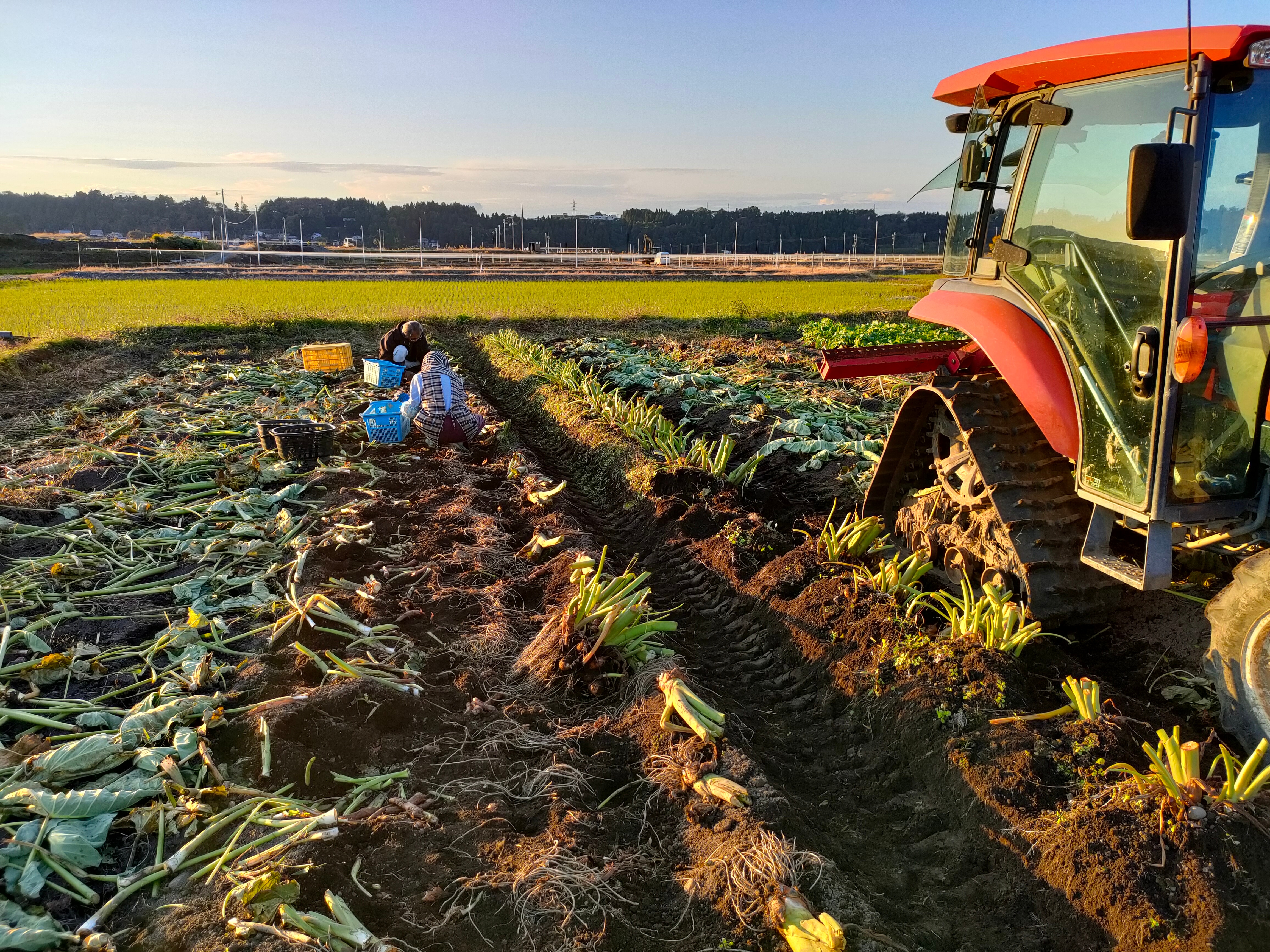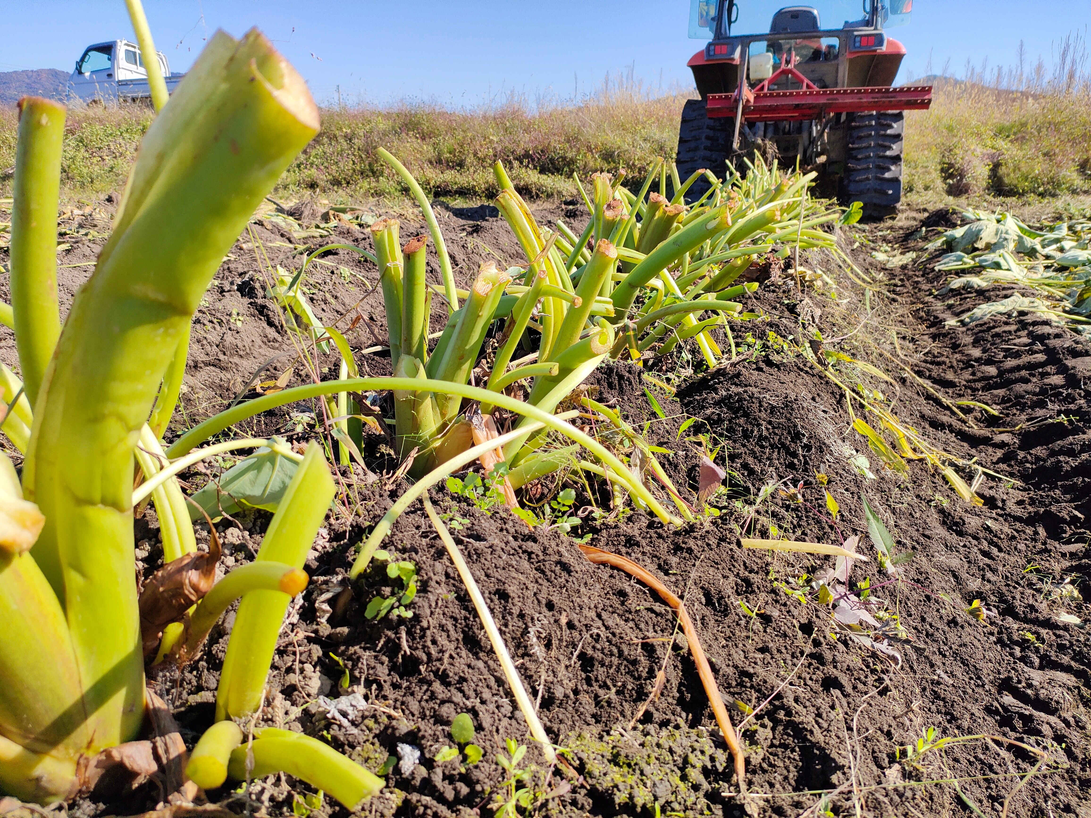 最初はスコップを使い手作業で掘っていましたが、予想より一株が大きく、とても終わらなそうなのでトラクターに芋掘り機を付けて掘り起こす事にしました。