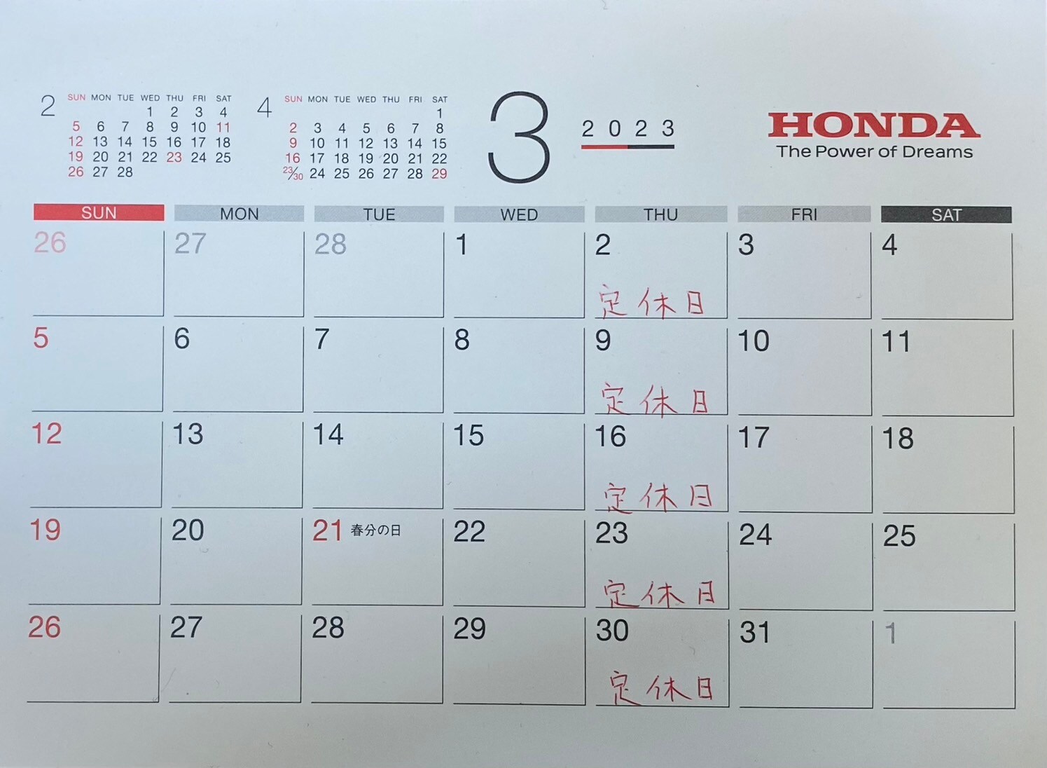 長くなりましたが、最後に3月の定休日のカレンダーを添付します。
