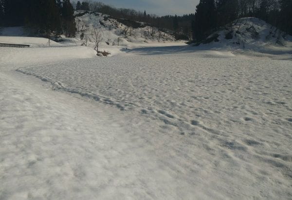 初雪が降った時に水路の落ち葉拾いをしていたら、クマの足跡があった。