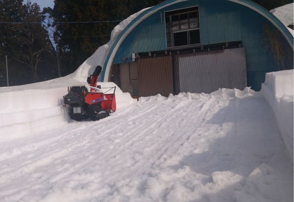 積雪が多いと、冬期間に眠っていた作業場の春先除雪も大変な労力が必要!