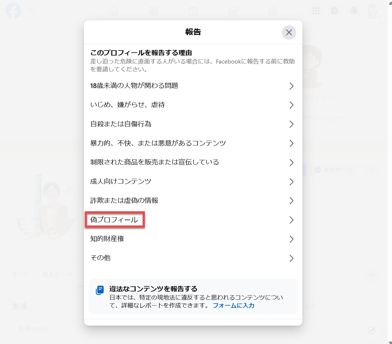 ・「偽プロフィール」を選択する