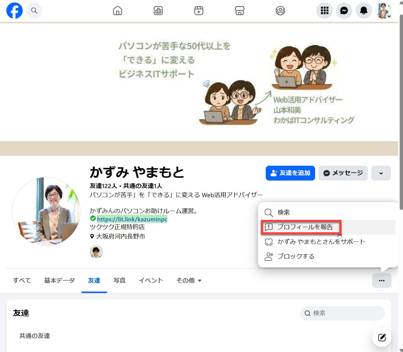プロフィールから簡単に報告できる流れがあります。