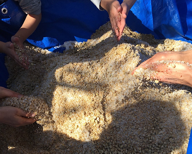 さて、竹切り組と、ラティスのペンキ塗り組みに分かれて作業してたのですが、ペンキ塗りも終わったということで、いよいよ醤油の仕込みに入ります。