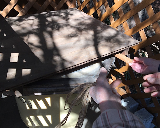 あとは組み立てたラティスの中に安置、寒冷紗のナイトキャップを被せ、蓋(ネットの)をして、屋根をかけて、も一つオマケにラティスの上からも屋根をかけて、紐で固定して出来上がり!!