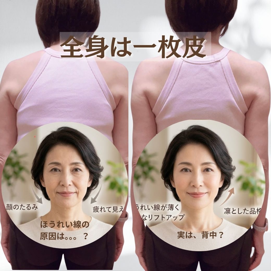 背中の皮膚が下に引っ張られ、それがお顔の「たるみ」や「ほうれい線」として現れてしまうのです。