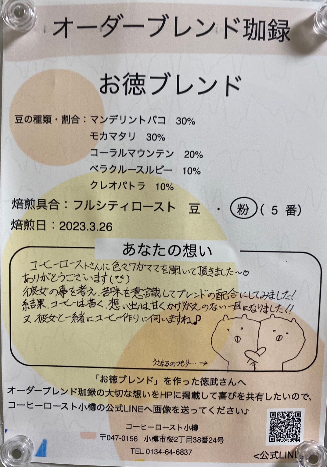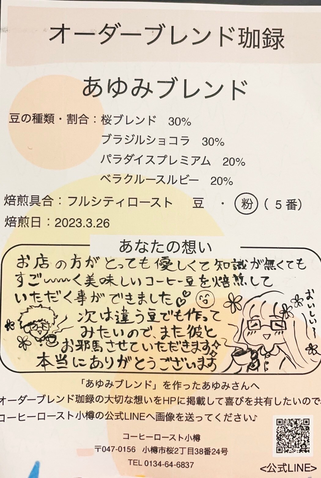 お店の方がとっても優しくて、知識が無くてもすごーーく美味しいコーヒー豆を焙煎していただく事ができました♡