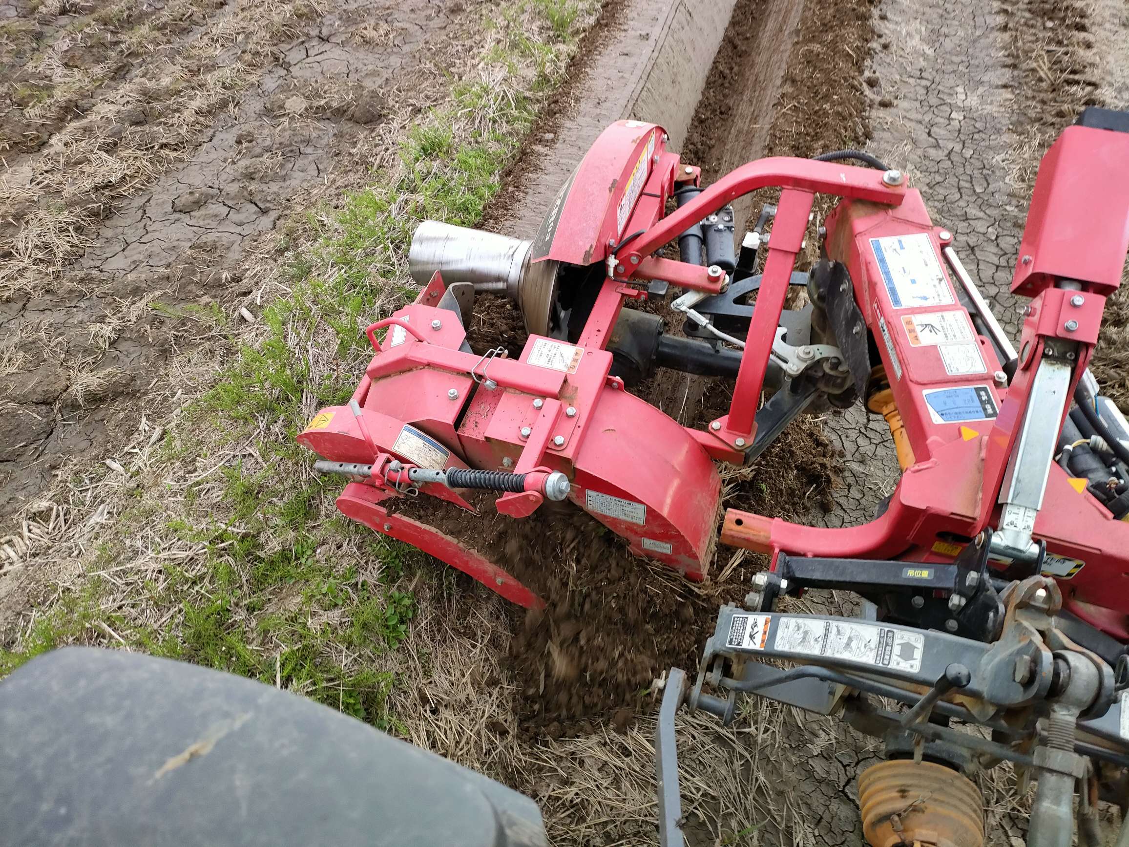 畦塗りは、機械前方の爪が一度畦を砕いて壊し、後方のドラムで新しく畦を成型していきます。