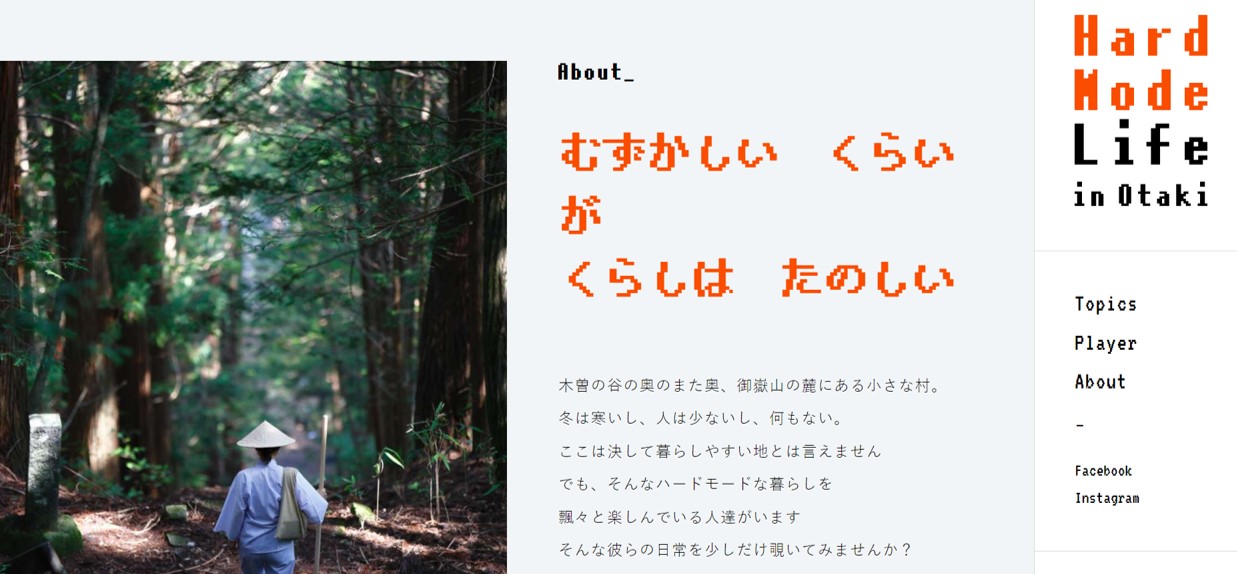 移住・定住促進のための表現方法は様々あると思うのですが、こちらのサイトでは『王滝という地にいる人々の思い・実際の暮らしや何故王滝なのか』など、人に焦点をあてた記事が掲載されています。