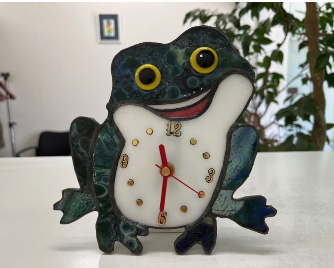 長年ファミリーでご利用いただいているH様より、蛙のステンドグラス時計を頂きました。