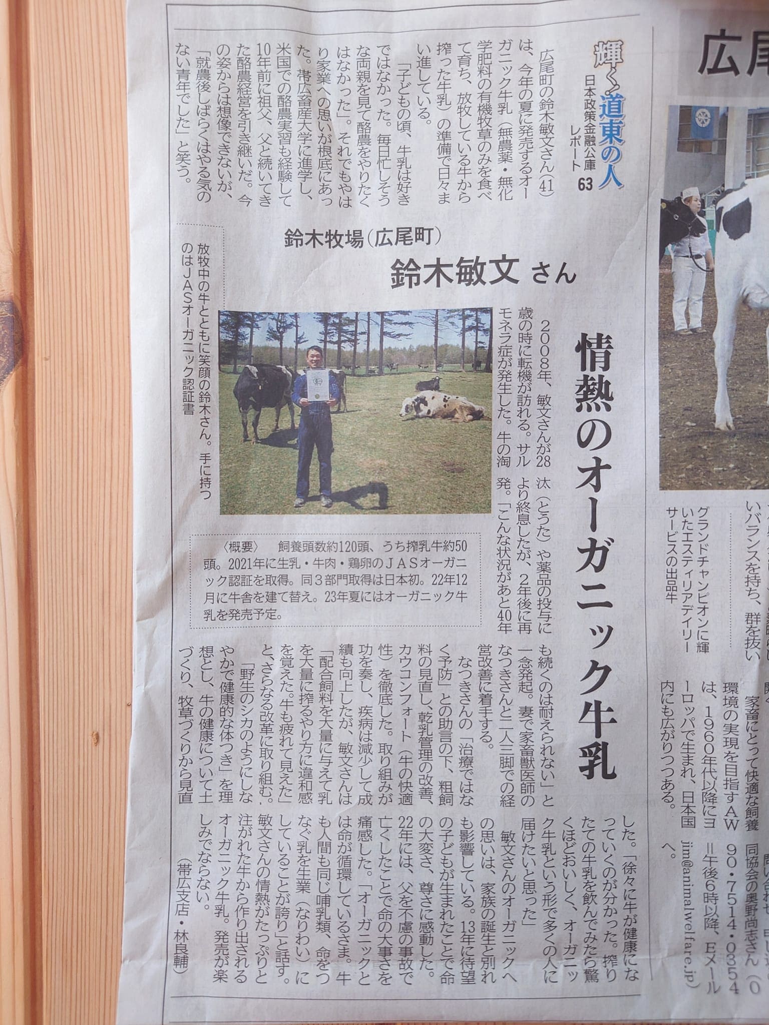5/20十勝毎日新聞「輝く!道東の人」に鈴木牧場の取り組みを掲載いただきました。