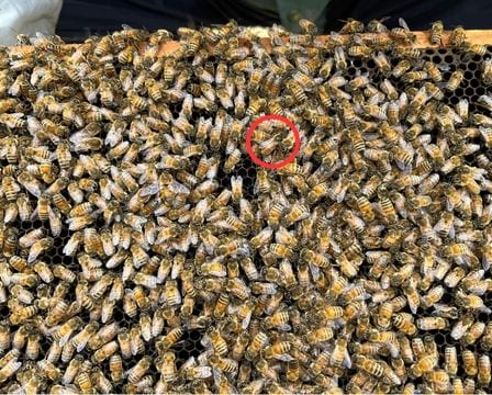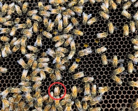 早速、正解の発表! 下記の写真の丸で囲んだハチがこれから女王蜂となる予定のミツバチです。