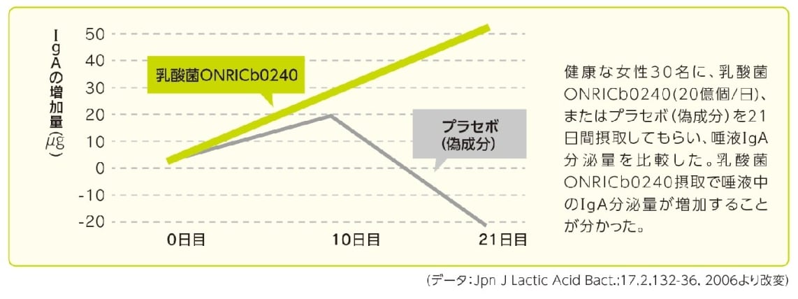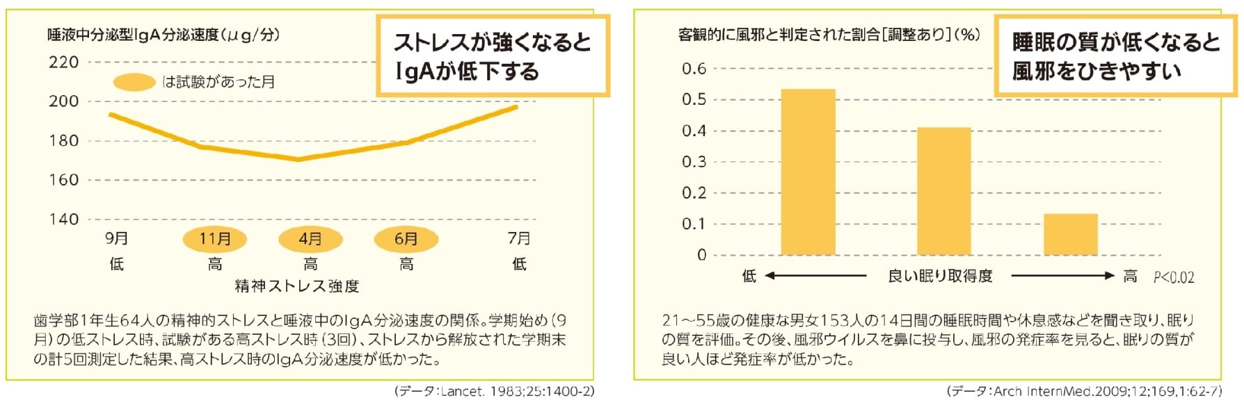 粘膜でのIgAの分泌量は身体を守る免疫力の目安だと考えられており、低下すると病氣にかかりやすくなります。
