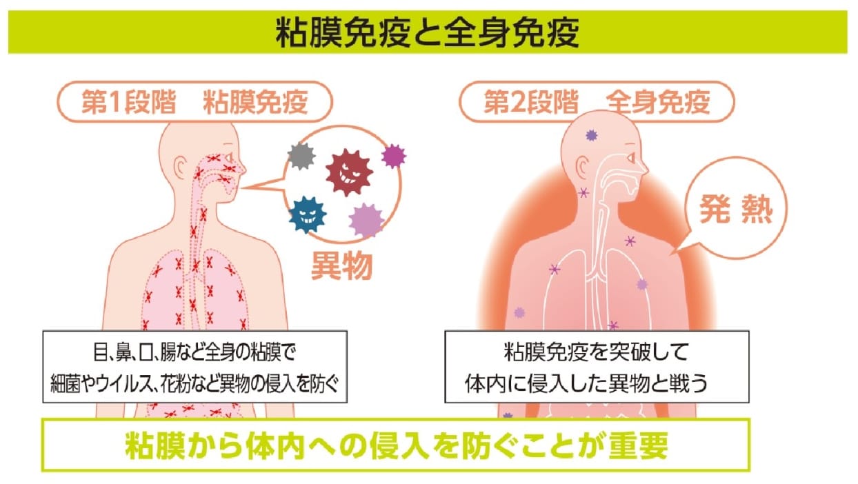 体内に異物が侵入するのを防ぐ「粘膜免疫」と粘膜免疫と戦う「全身免疫」です。