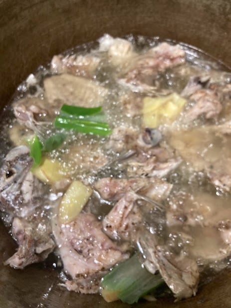 香味油で使用した鯛のアラを水と香味野菜で煮だし、鯛のだしを引いていきます❗️