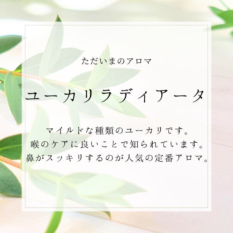 今回は定番人気のユーカリです。スーッとして鼻や喉のケアに効果があることがよく知られていますね。「ユーカリラディアータ」は、ユーカリの中でも穏やかでマイルドなタイプです。