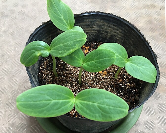 畑で蒔いたら、全然発芽しなかったキュウリは、ポットで育てて持っていくことにしました。