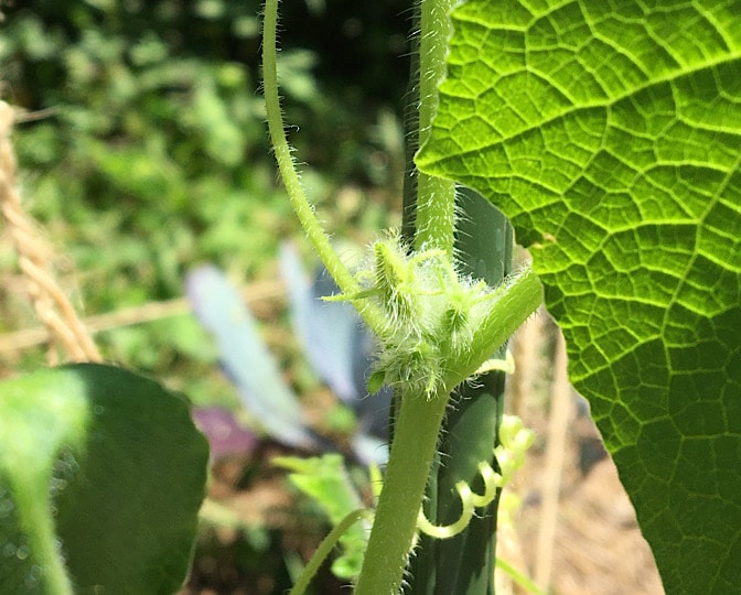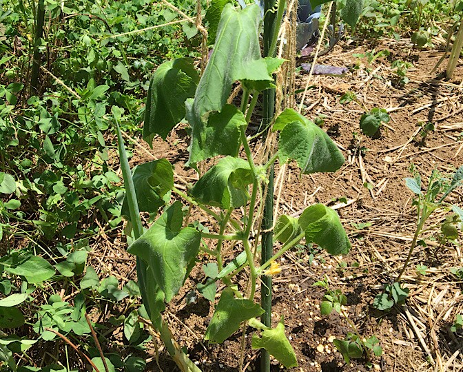 キュウリの花が咲いてたので、5節まで子蔓…というか花芽を取りました。