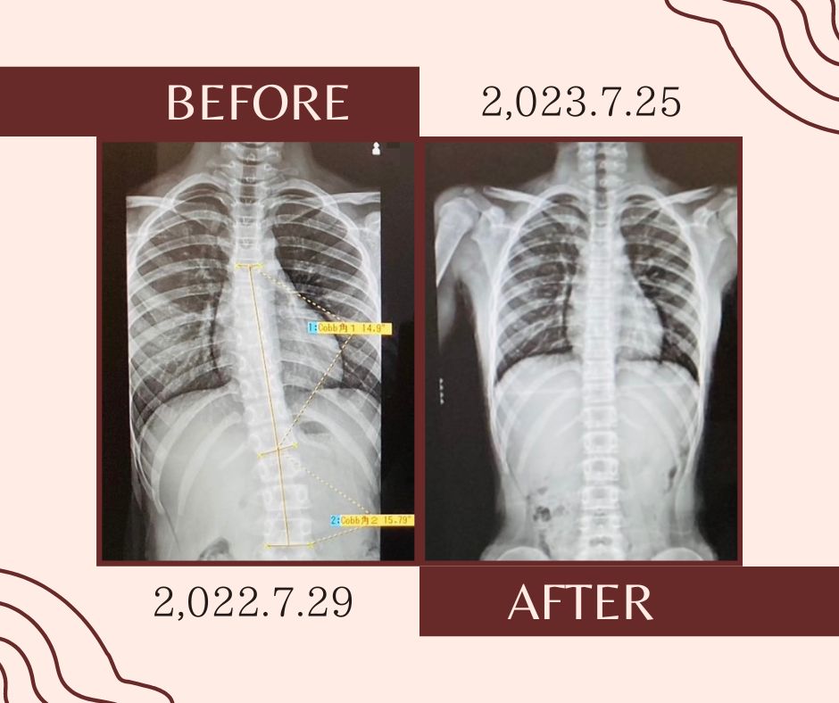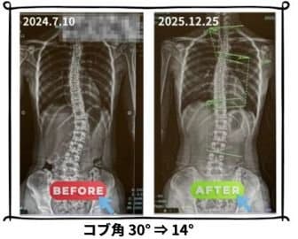 コブ角(側弯症の指標)が14度、15度からの真っ直ぐ背骨です。